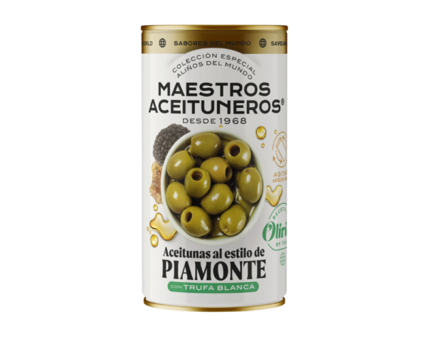 Sastāvs: Zaļās olīvas bez kauliņiem, marinētas melno trifeļu (tartufa) mērcē, ar pievienotu dabīgo balto trifeļu ekstraktu.